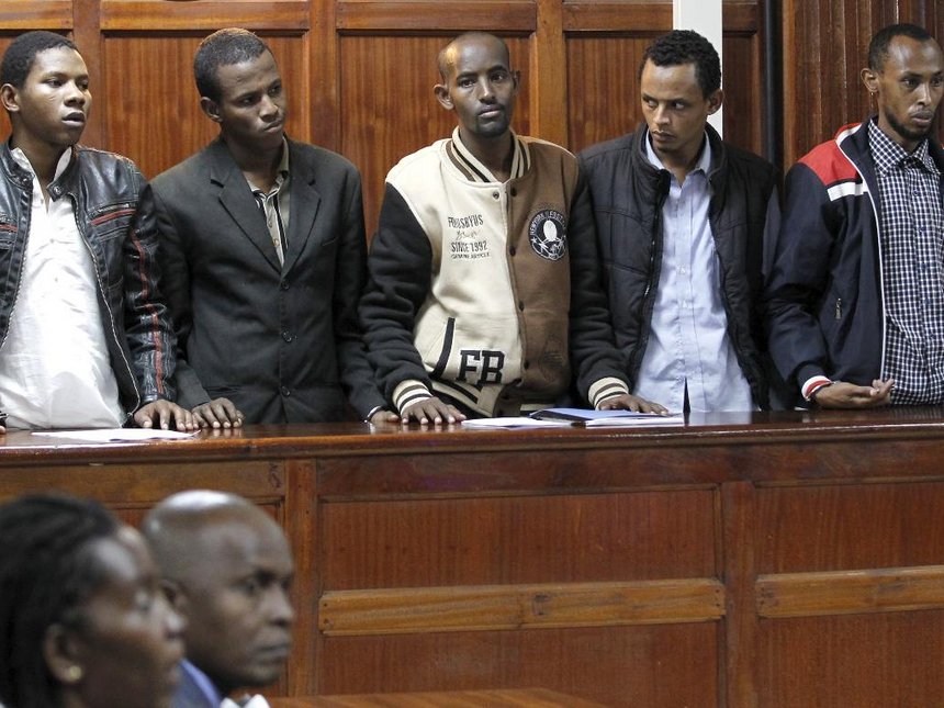 Tanzanian national Rashid Charles Mberesero (L) stands inside the dock with Osman Abdi Dakane (2nd L), Sahal Diriye Hussein (C), Hassan Aden Hassan (2nd R), Mohamed Abdi Abikar (R) at the Milimani Law Courts in Kenya’s capital Nairobi, June 4, 2015. The five men were charged in connection with an attack by Somali Islamist gunmen on Garissa University./REUTERS
